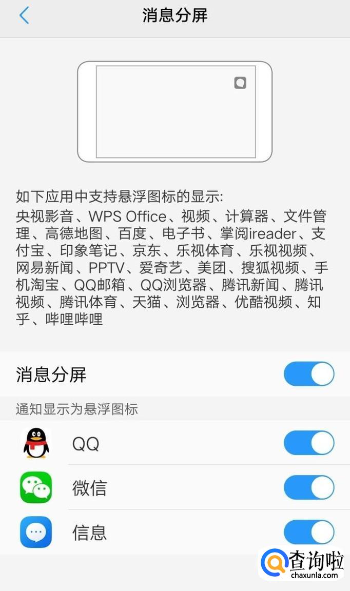 在这里勾选上消息分屏,注意,这个分屏不是所有的应用都支持,具体支持的应用请看手机界面的显示!