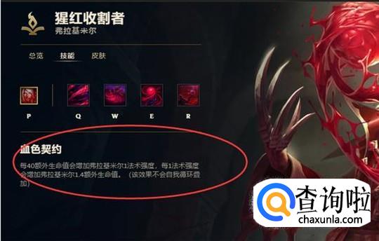 首先了解一下吸血鬼的技能,被动技能:血色契约,每40额外生命值会增加他一额外法术强度,每一法术强度会增加他1.4额外生命值。这个技能的存在是得吸血鬼比其他的大部分法师要肉上许多,容错率更高。