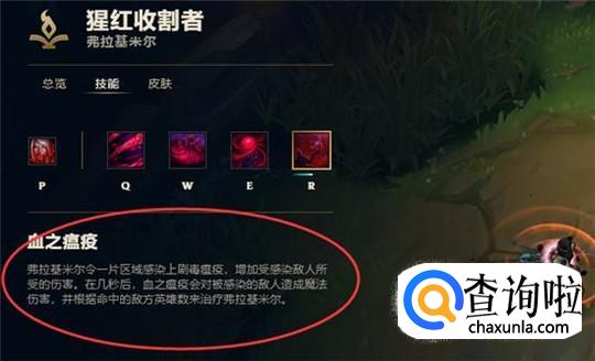 r技能血之瘟疫:弗拉基米尔令一片区域感染上剧毒瘟疫增加感染敌人所受的伤害。在几秒后,血之瘟疫会对被感染的敌人造成魔法伤害,并根据所命中的敌人数量来治疗弗拉基米尔。