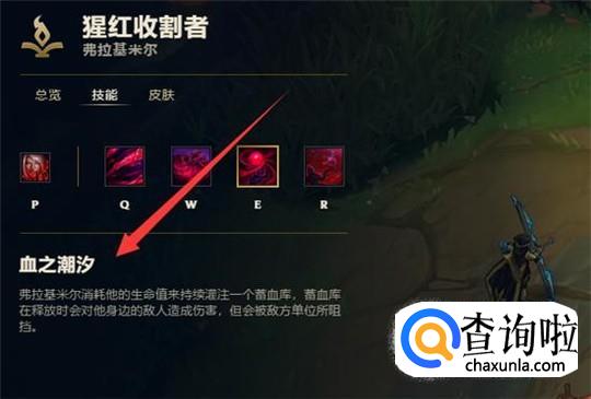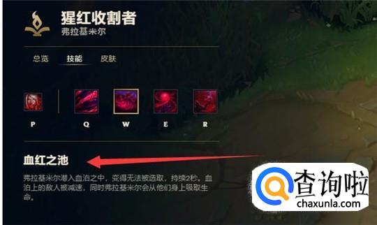 w技能血红之池:弗拉基米尔潜入血池之中,变得不可被选取,持续两秒,在血池上的敌人会被减速,同时可以吸取他们的生命值。这个技能可以很好地规避一些来自敌方关键性的控制技能。e技能:弗拉基米尔消耗他的生命值来灌注一个蓄血池,蓄血池释放时会对周围敌人造成伤害,蓄满时可减速敌人。