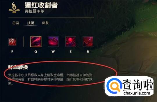 q技能鲜血转换:弗拉基米尔从敌人身上偷取生命值,当弗拉基米尔的资源槽攒满后,此技能的伤害和治疗效果将会大大提升。在线上灵活运用此技能可以很好的将自己的血线保持在建康水平,续航能力非常强。