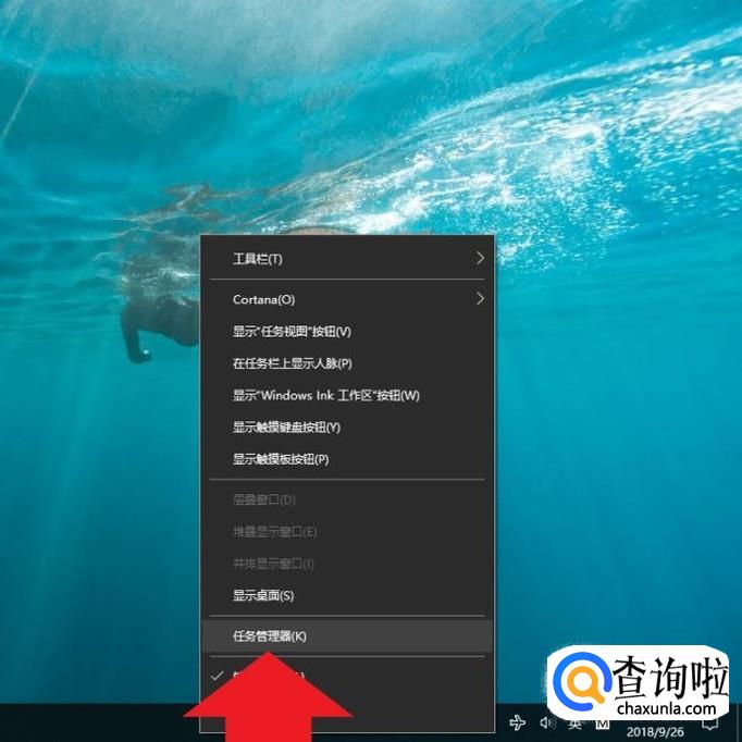 首先鼠标右击电脑桌面任务栏,然后点击进入“任务管理器”选项。
