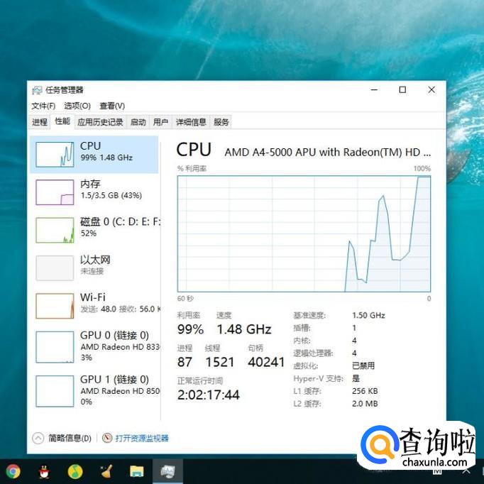 最后就可以看到跟CPU有关的内核、线程、速度和利用率等信息。