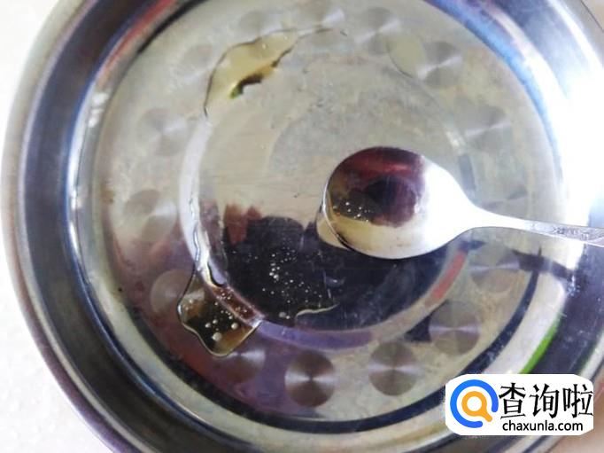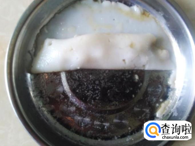 用一个碟子,然后用油把里面全面刷过,然后把适量米浆倒到碟子。【米浆放量少些,粉肠越薄越好吃】