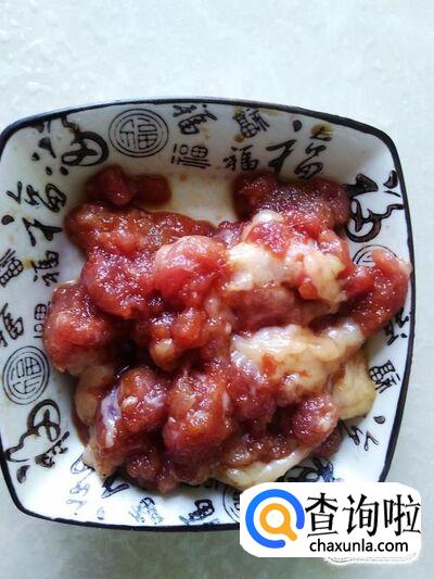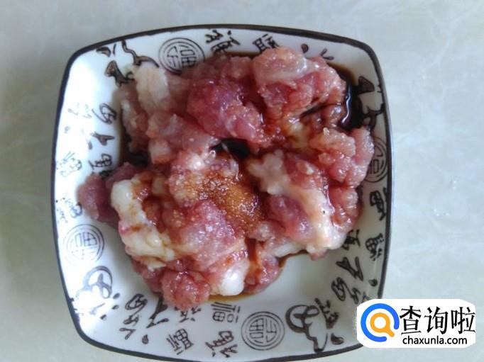 瘦肉剁成肉饼,加适量的盐,生抽腌制几分钟。