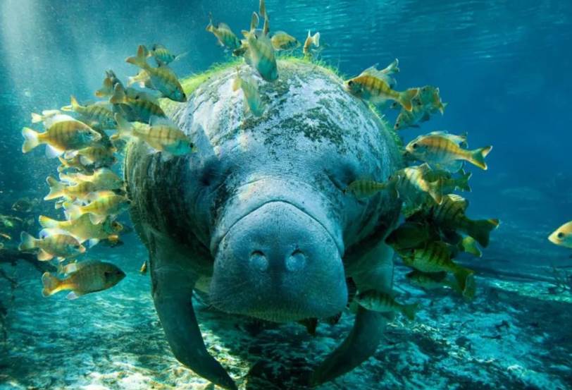 海牛(学名:Trichechu ;英文名:Manatee):仅1科1属3种。美洲海牛、亚马逊海牛和非洲海牛。海洋哺乳动物,形状略像鲸,前肢像鳍,后肢已退化,尾巴圆形,全身光滑无毛,皮厚,灰黑色,有很深的皱纹。以海藻或其他水生植物为食。