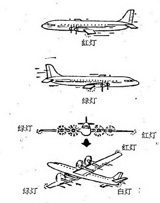 天空虽然非常辽阔,但是现代飞机的速度很快,因此仍然会有对撞的危险。要避免空中对撞事故,除了对定期航班的民航飞机规定一定的航线以外,同时飞行员在空中还必须注意观察前后左右的情况。为了便于飞行员观察周围有没有飞机,随时了解别的飞机同自己航向的关系怎么样,因此在夜航的时候,要在飞机的左右两侧和尾部开三盏航行灯:从飞行员的位置来看,红灯总是装在左翼尖,绿灯装在右翼尖,白灯装在机尾。三盏灯可以连续点亮,也可以断续点亮。