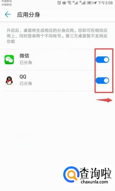 弹出的界面,我们看到有两个应用可以分身,我们将两个应用的开关向右滑动打开,之后我们就可以看到手机桌面上有两个QQ和微信了,这样我们就可以登录两个QQ和微信了。