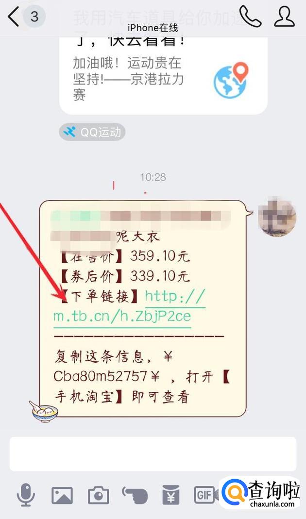 在QQ的输入框中,黏贴淘宝客链接,并发送出去,就可以看到淘宝客链接了。