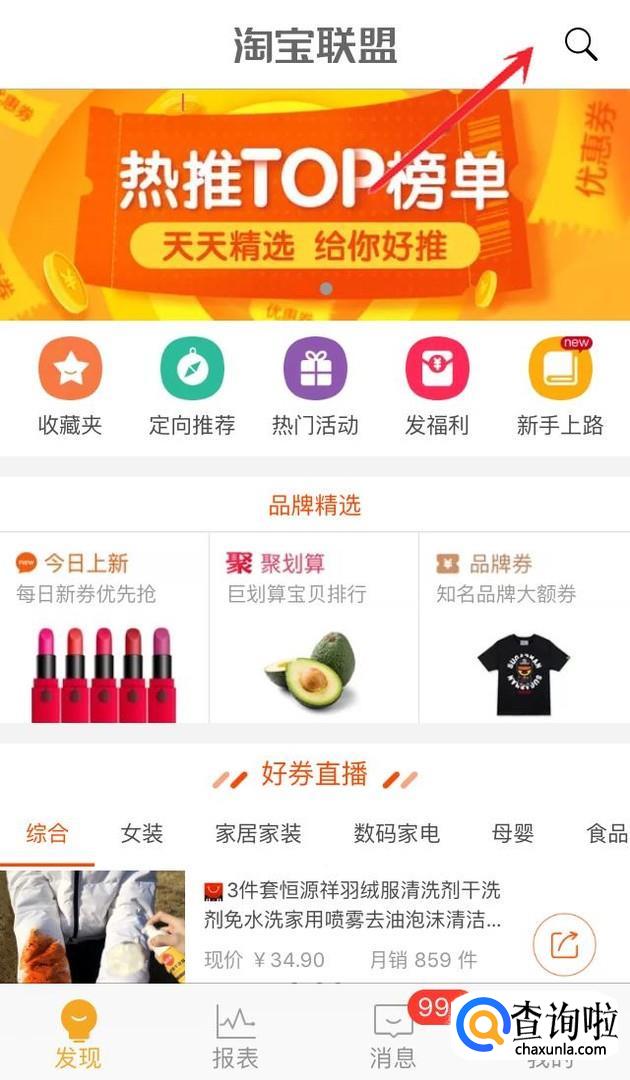 接着,打开淘宝联盟APP,点击右上方的放大镜。