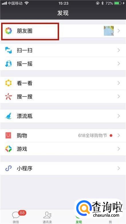 首先点击微信中的朋友圈,如下图所示。
