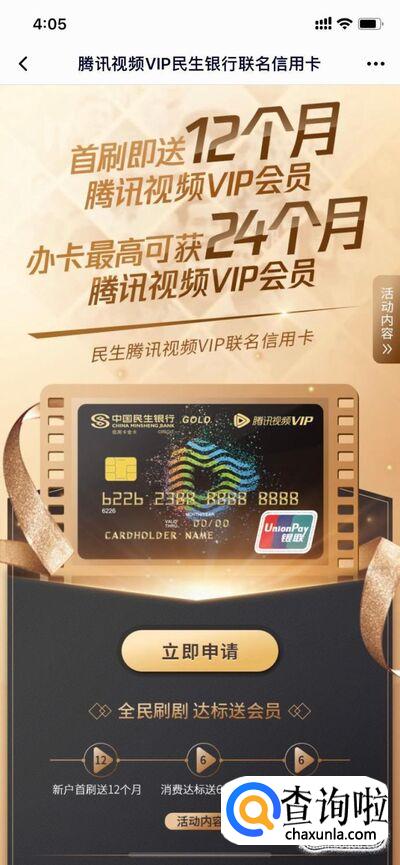 点击“会员联名卡”,目前有一个腾讯视频和民生银行合作的活动,办理腾讯视频和民生银行联名信用卡,新用户首次刷卡送12个月腾讯视频VIP,消费达到一定金额送6个月腾讯视频VIP,使用信用卡分期达到一定金额送6个月腾讯视频VIP。这个活动的力度非常大,如果正好要办理信用卡,可以参加这个活动。活动截止到2019年9月30日。