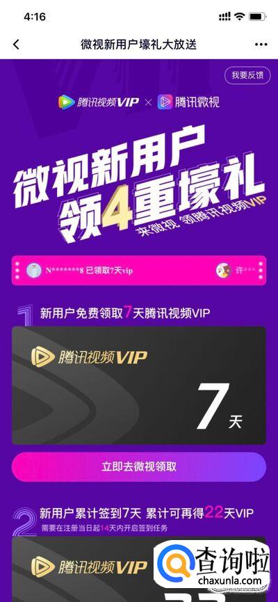 “免费送VIP”是一个腾讯视频和腾讯微视合作的活动,操作起来也比较简单,只需要下载腾讯微视,新用户免费领取7天腾讯视频VIP,连续签到7天,还可以再获得22天VIP。活动截止到2019年9月4日。