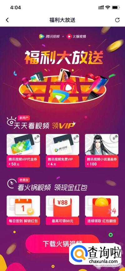 点击“免费领VIP”,目前有一个腾讯视频和火锅视频合作的活动,只要下载火锅视频,就可以免费领取腾讯视频VIP4天。还有腾讯视频VIP代金券50元,这样自己买会员的话也更加便宜了。活动截止到2019年9月30日。