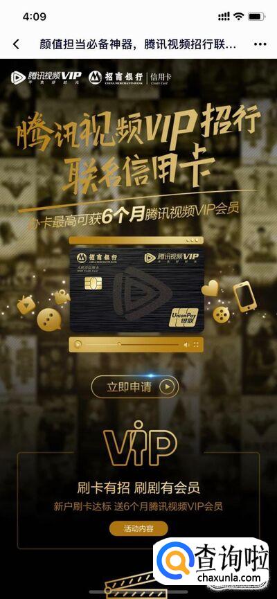 点击“联名银行卡”,是腾讯视频和招商银行合作的活动,不过这个活动力度没有“会员联名卡”的力度大,新用户刷卡达到一定金额,赠送6个月腾讯视频VIP。活动截止到2019年12月31日。
