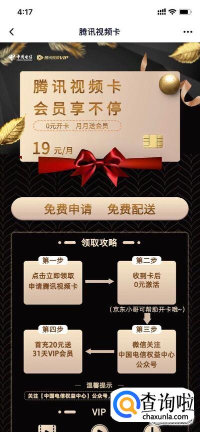 “开卡领会员”活动,申领中国电信和腾讯视频合作的腾讯视频卡,首冲20元即送31天腾讯视频VIP。