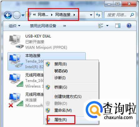 然后点击打开网络和共享中心,并在更改适配器设置中找到本地连接,点击右键打开属性窗口。
