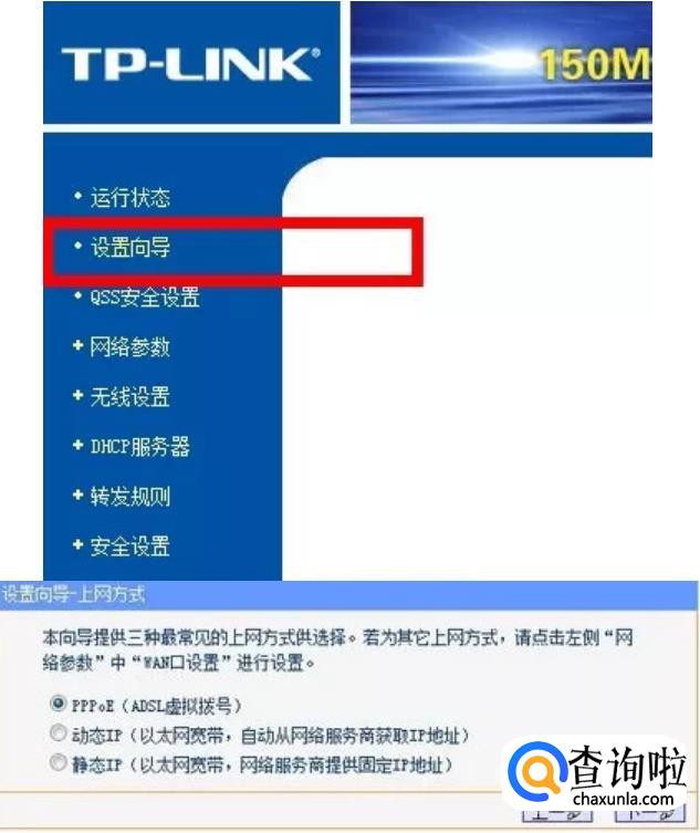 接下来在左边的导航中找到进入设置向导,弹出来的窗口中点击下一步,找到pppoE设置,然后点击下一步。