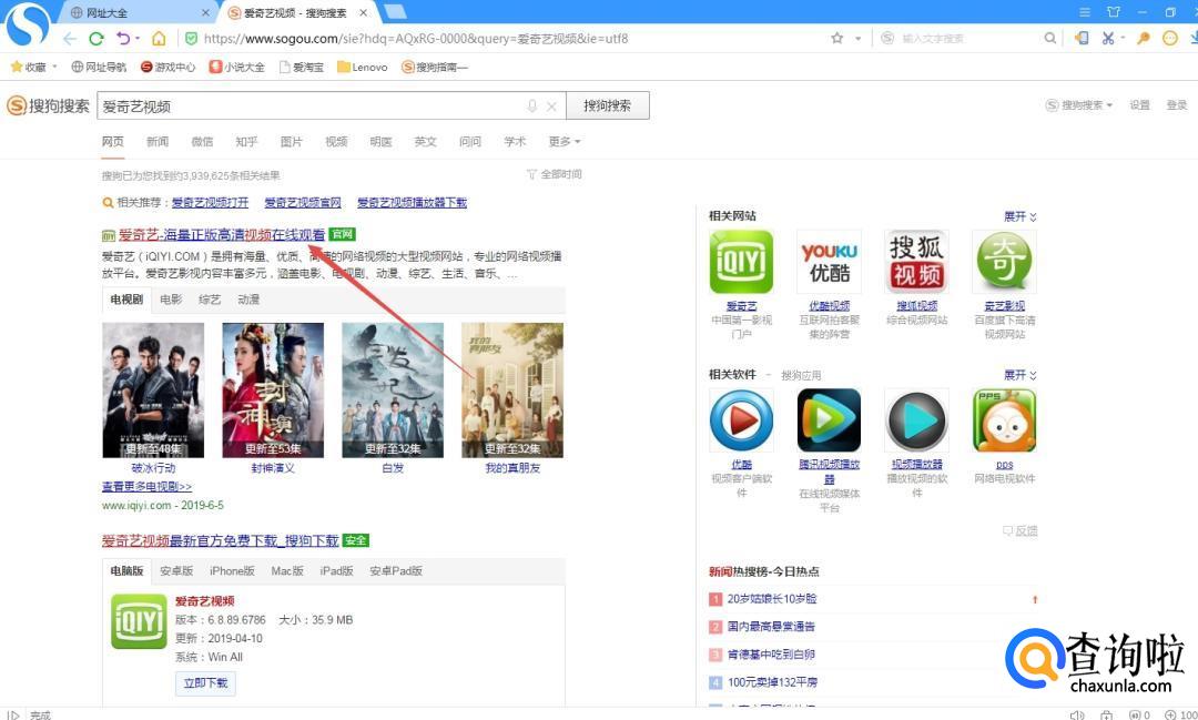 首先,我们在搜狗浏览器中搜索爱奇艺官方网站,点击进入。