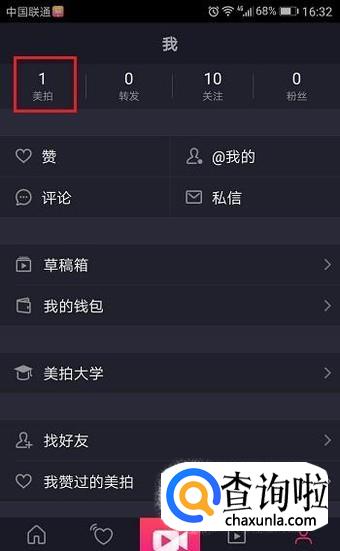 登录成功过后点击屏幕下方的“我”,可以看到有“美拍”这个选项,下面标注的数字是自己录取的视频数量,再点击“美拍”