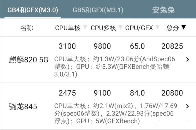 由此可见,麒麟 820 的CPU 性能介乎于骁龙 765G 和骁龙 855 之间,并且跟麒麟 980 十分接近。