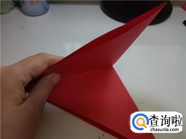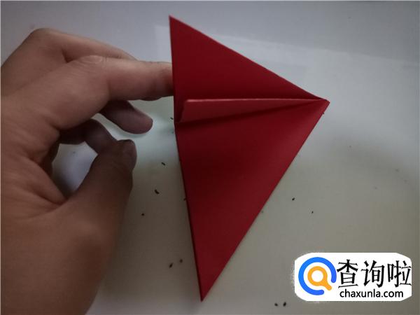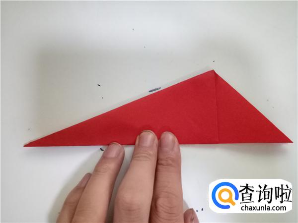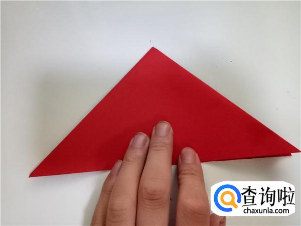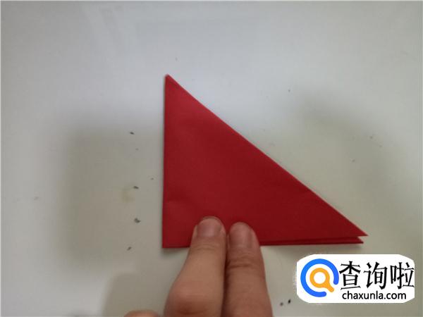 再将折纸对折一次,折出小三角,如图所示。