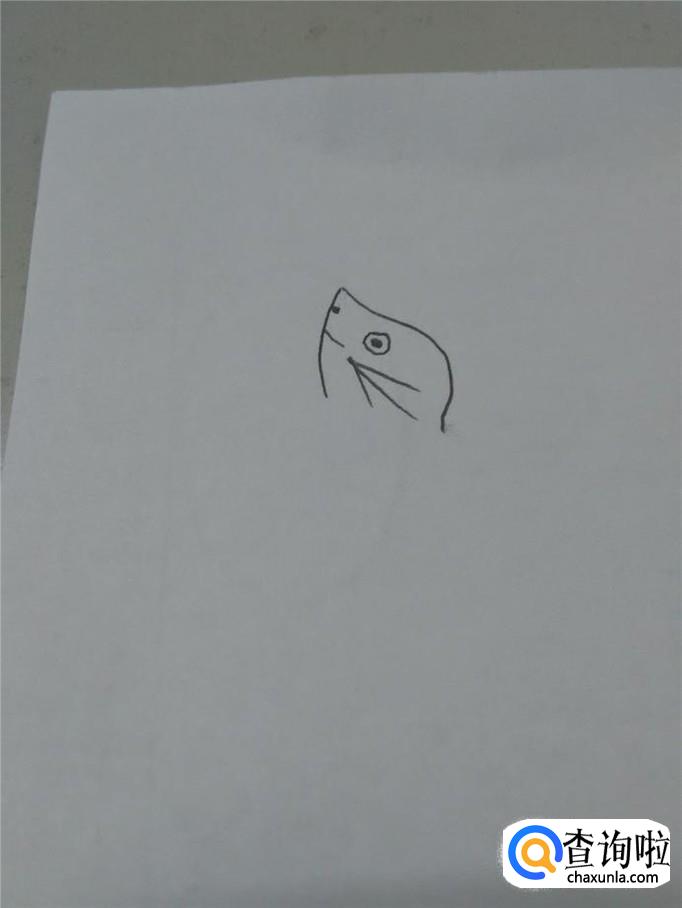 在鼻子的左下方,点一个黑点,表示鼻孔,在鼻子下面画一条短的弧线,表示嘴。在眼睛的下面,画三条相交的直线,表示胡须。