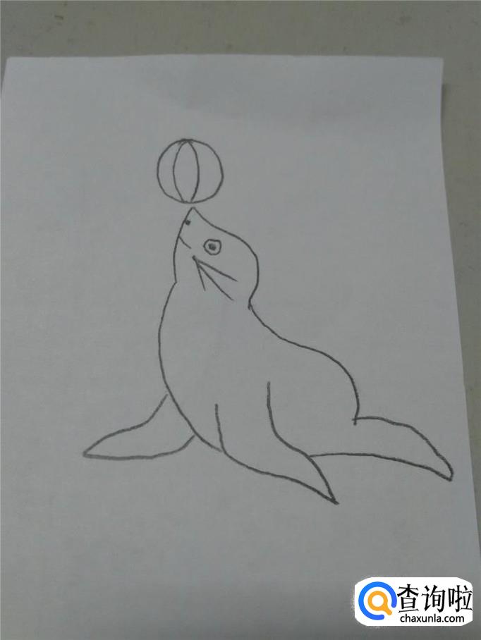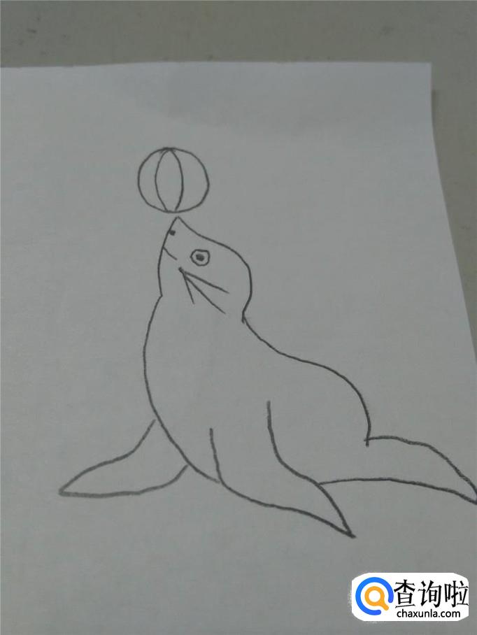 最后,在它头部上方画一个圆形,表示球,在球里再画两条弧线,表示上面的花纹,海豹就画完了。