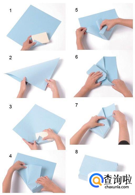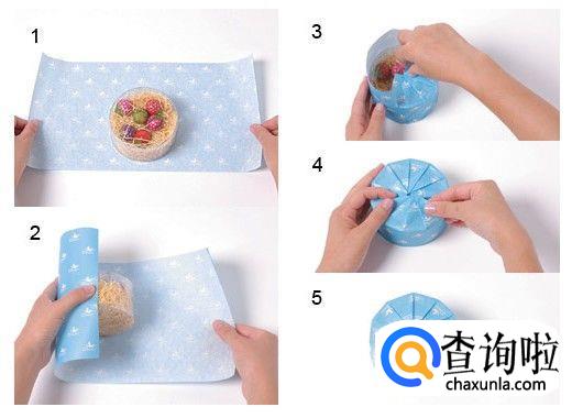 准备一张大小合适的纸,将纸沿盒子边缘向内侧折入,使纸张的角位于盒盖上方(如①),然后把后方的纸折到前面,保证能盖住盒子的全体为宜(如②),按住上方的折角不动,把左侧的纸也折起来,并把多余的纸干净地收到内侧,用胶带将上方折角和左侧折主的约固定,把后方的纸也折起来或把盒子慢慢扶起来(如④),整理多余的纸的同时,再将盒子向里侧翻倒,右侧的纸可以用与左侧相同的办法,保持折垂直的前提下把纸向内折入,剩余的纸张要向内侧折起(如⑦),整理好,最后把多余的边角向内部折入,用双面胶固定就可以了,再在盒子上系好丝带就完成了。