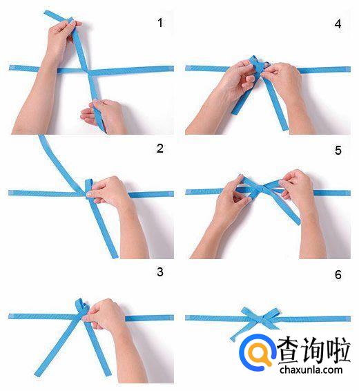 不管什么物品,即使没有包装纸或箱子,也不装在袋子里,只要系一根丝带,就会不可思议的瞬间变成一件礼物。如果打上漂亮的蝴蝶结,就会立刻增添礼物本身的魅力。将丝带横向系实,正面向外(如1),左右两种侧折成花瓣大小,左侧折出的花瓣长于右侧(如2),左右交叉,中心留孔,长侧从孔中穿出(如4),左右整理成相等大小,根据蝴蝶结的大小把丝带裁剪成合适的长度,就完成了。