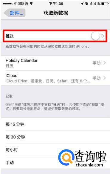 邮件的推送功能造成的功耗也是不容小觑的。进入设置-邮件、通讯录、日历-获取新数据 选项,手动关闭推送功能,或降低推送的频率,可以设置每 15 分钟、每 30 分钟、每小时来获取推送。