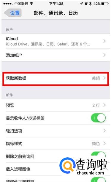 「 设置 —邮件、通讯录、日历 — 获取新数据 」