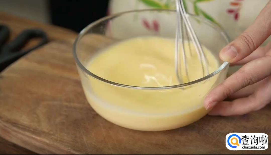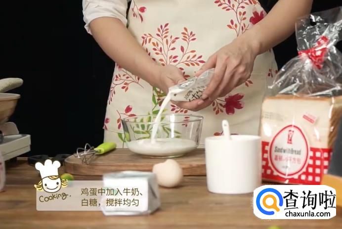 准备好材料后,先将鸡蛋打入碗中,再加入牛奶和白糖,均匀搅拌。