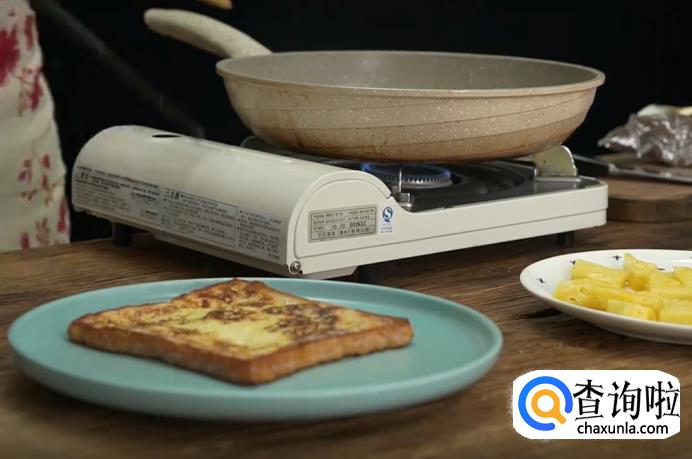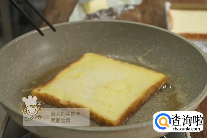 然后将静置好的吐司面包片放入锅中,煎至吐司面包的两面都变成金黄为止,煎好后盛入盘中。