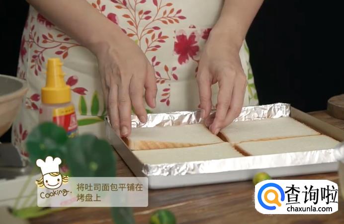 把准备好的吐司面包平铺在烤盘上,烤盘预先需要垫一层锡箔纸在上面。