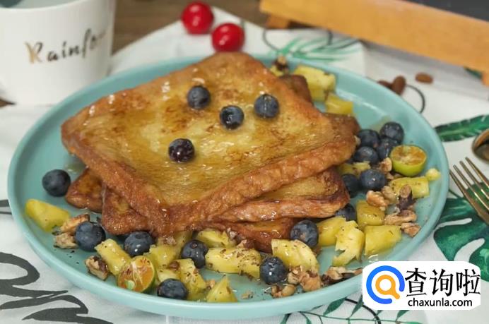 待所有的吐司都煎好装盘后,在盘中撒上凤梨、蓝莓进行摆盘,最后再挤适量枫糖浆,这道法式吐司就大功告成了。