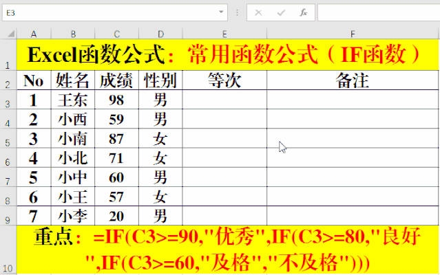 IF函数:条件判断。目的:判断相应的分数,划分类别。在目标单元格中输入公式:=IF(C3=100,"满分",IF(C3>=95,"优秀",IF(C3>=80,"良好",IF(C3>=60,"及格","不及格"))))。