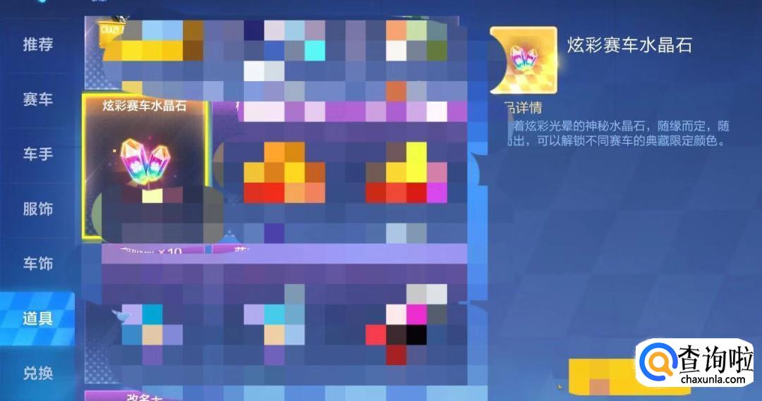 在道具里面找到“炫彩赛车水晶石”并点击选中它,选中过后点击右下角黄色按钮。