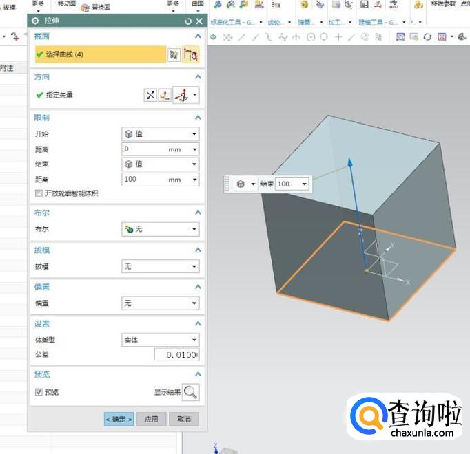 点击“拉伸”命令,填好参数,我们就可以画出一个正方体。长用的建模命令有:拉伸,旋转,管道,球,等等。