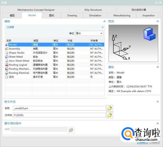 点击左上角的“新建”命令,打开新建对话框。可以看到有很多模块可以选择,选择“建模”模块。对话框底部可以选择创建的文件的文件名和保存路径,按照自己的需要更改。