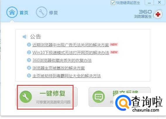 如果是360浏览器出现问题的话,可以打开360医生,然后点击一键修复按钮,进行修复即可。