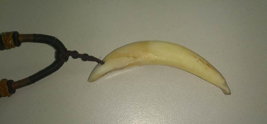 狗牙辟邪的说法在民间流传已久,相传,天狗曾咬断恶魔九头鸟的一只头,于是妖魔鬼怪见狗丧胆。狗的灵气集中在狗牙上,狗牙在民间被制作成吊坠来佩戴,有辟邪的功能。特别是在小儿夜啼、睡眠不实、惊吓、惊悸方面非常有效。
