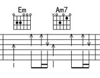 扫弦节奏记谱:用“↑”、“↓”符号表示,此时六线谱上一般有关于左手指法的提示。