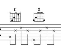 分解和弦伴奏记谱:符号为“X”,如果你用左手按好和弦,“X”表示用右手指弹响其所在的弦。