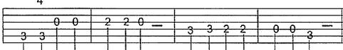如图:本谱从左往右看,第一个小节就是依次弹响五弦三品,五弦三品,三弦空品,三弦空品。