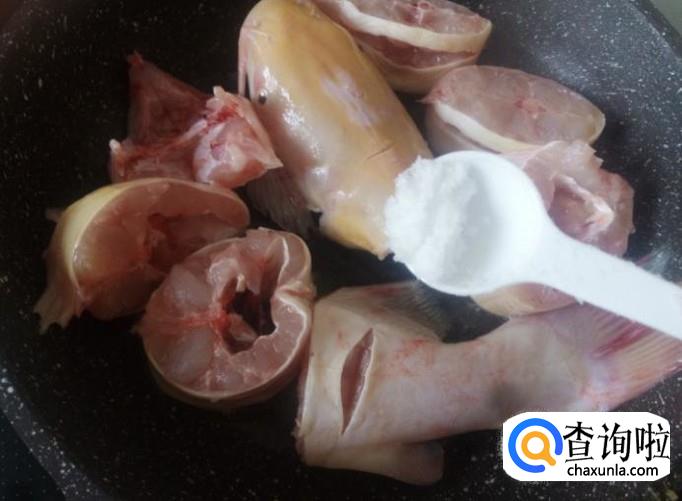 开火下油,用筷子把鱼夹摆到锅里,然后撒适量的盐花用小火煎。