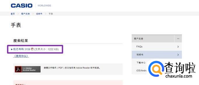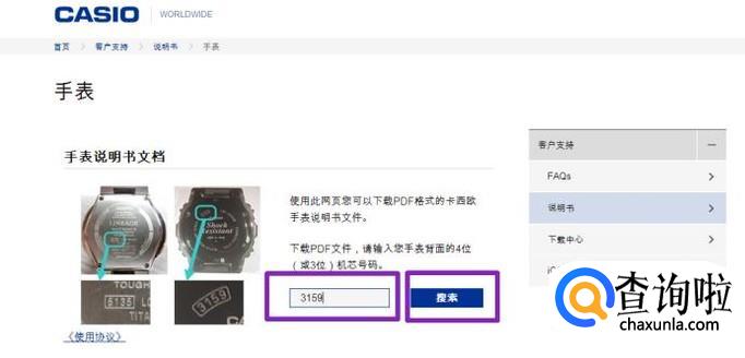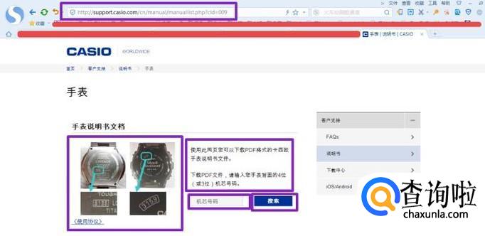 首先,我们登陆如图示的卡西欧官网,图示中说的很明白,我们需要输入机芯上面的号码;