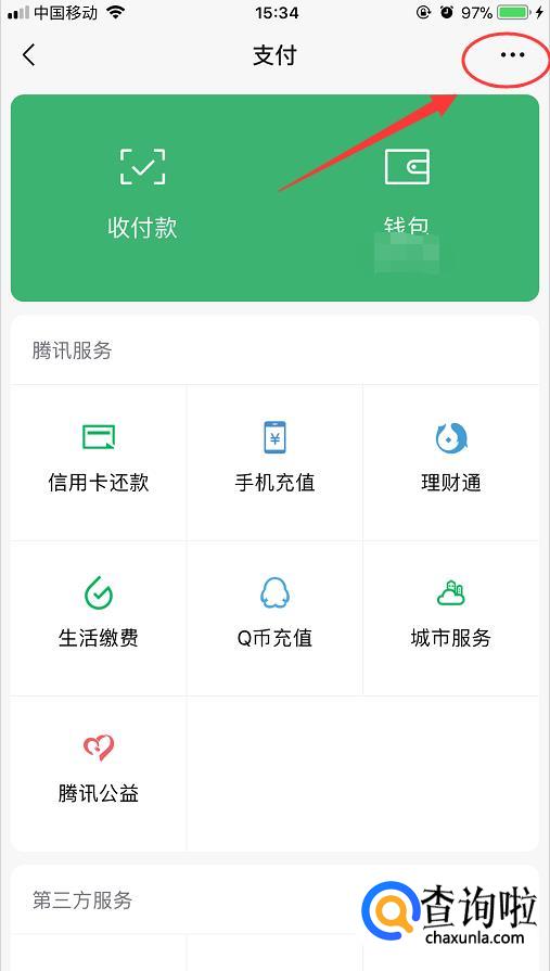 录好之后,进入微信“支付”页面,点击右上角三个小点的图标;