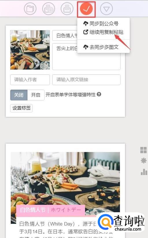 然后我们根据自己的需求,修改模板里面的内容,点击上方的加号图标,找到“继续用复制粘贴”点击进入这个选项。