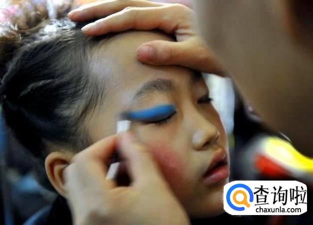 在画上眼影,如果是演出妆,一般老师规定的有眼影颜色,眼影颜色要统一,我给女儿画的是紫色。